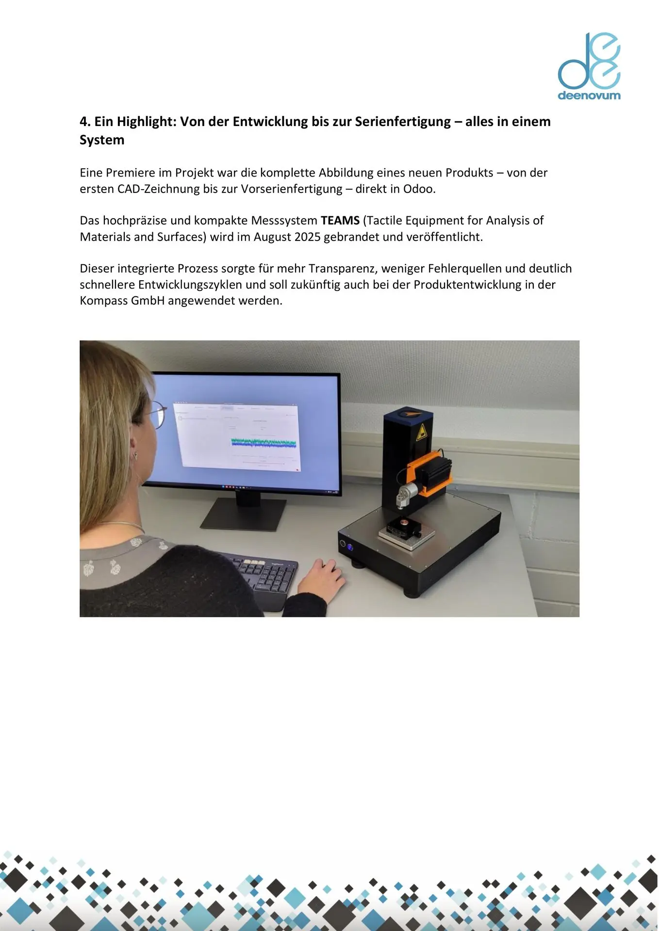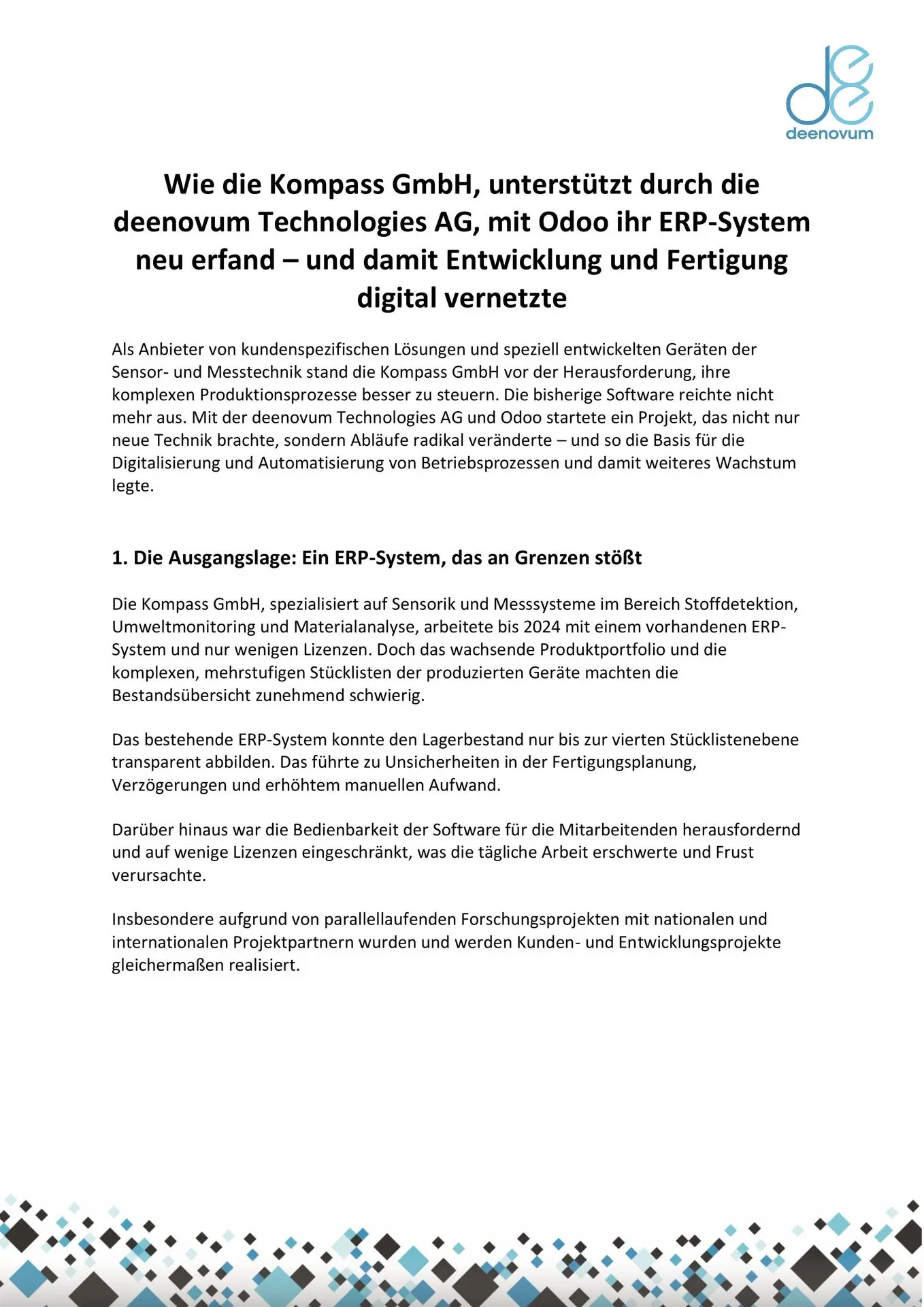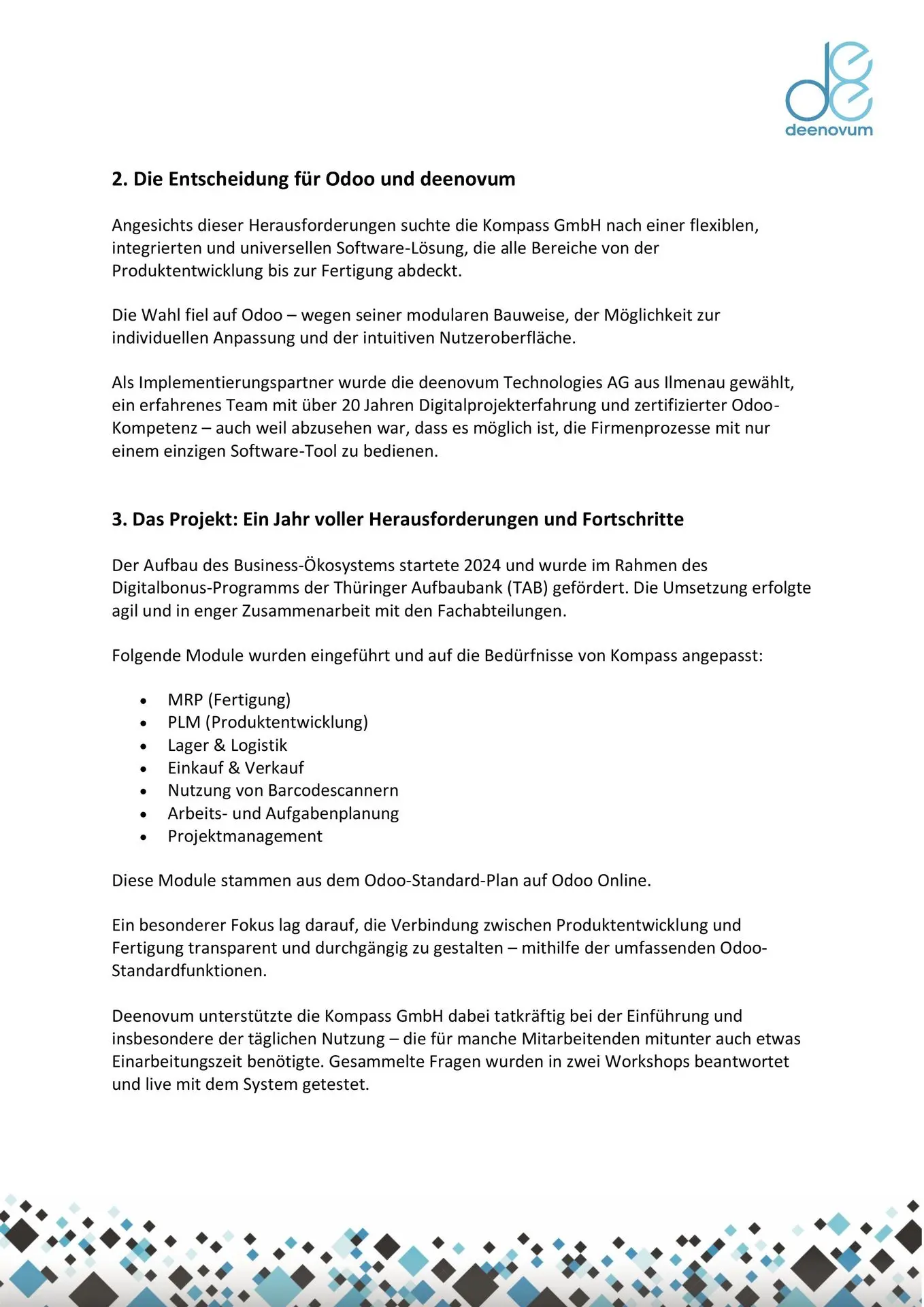 Gemeinsam mit dem Team der Kompass GmbH haben wir von der deenovum Technologies AG nicht einfach ein ERP-System implementiert – wir haben Entwicklung und Fertigung digital vernetzt, Prozesse durchgängig gestaltet und den Grundstein für künftiges Wachstum gelegt. Vom ersten CAD-Entwurf bis zur Vorserienfertigung eines neuen Produkts – alles in einem System.